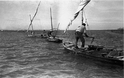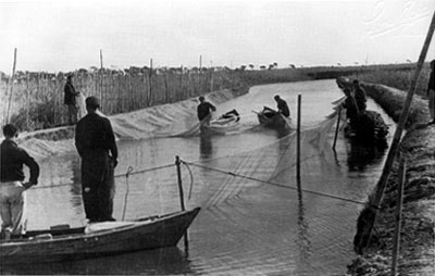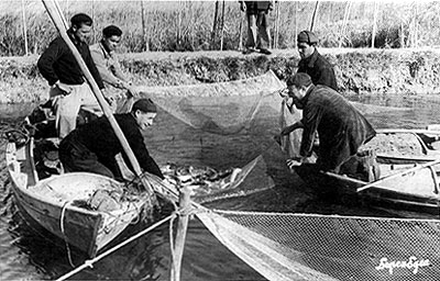 Formando la “companya”, en barcas con dos hombres en cada una, con cajas para el pescado y un montón de redes, se forma un equipo con varias de ellas. Buscan la zona más idónea en cada momento para la pesca y forman círculos con las barcas, donde en cada una de ellas mientras uno percha, otro va dejando caer las redes, por lo general “tirs”, que unidas las de una barca con las de las otras, forman un cilindro cerrado en cuyo interior quedan apresados los peces. Una vez cerrado el llamado “vol”, se instalan otras redes, llamadas “saltaes”, o redes planas que flotan en la superficie y se disponen en todo el contorno del “vol” tersas y unidas con cañas (como si fuera un sombrero de copa invertido). La llisa, que huyendo salta del “vol” cae sobre las “saltaes”. Seguidamente entran con las barcas dentro del circulo y siguen calando más “tirs” formando espirales o “corrals”; salen después y esperan mientras los peces quedan apresados en los “corrals”, “vols” y “saltaes”. Solo hay que recogerlos luego a mano.